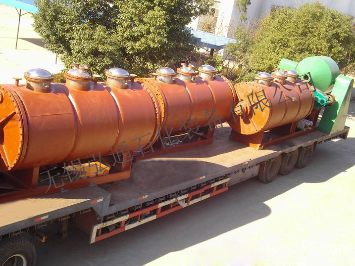 具有結構簡單操作方便,使用周期長,性能穩定可靠,蒸汽耗暈小,適用性能強,產品質量好,特別適用于不耐高溫、易燃、調溫下易氧化的膏狀物料的干燥,該機經用戶長期使用證明是一良好的干燥設備。原理:被干燥物料從殼體上方正中間加入,在不斷正反轉動的耙齒的攪伴下,物料軸向來回走動,與殼體內壁接觸的表面不斷新,受到蒸汽的間接加熱,耙齒的均勻攪拌,粉碎棒的粉碎,使物料表面水分有利的排出,氣化的水分經干式除塵器、濕式除塵器、冷凝器,從真空泵出口處放空。